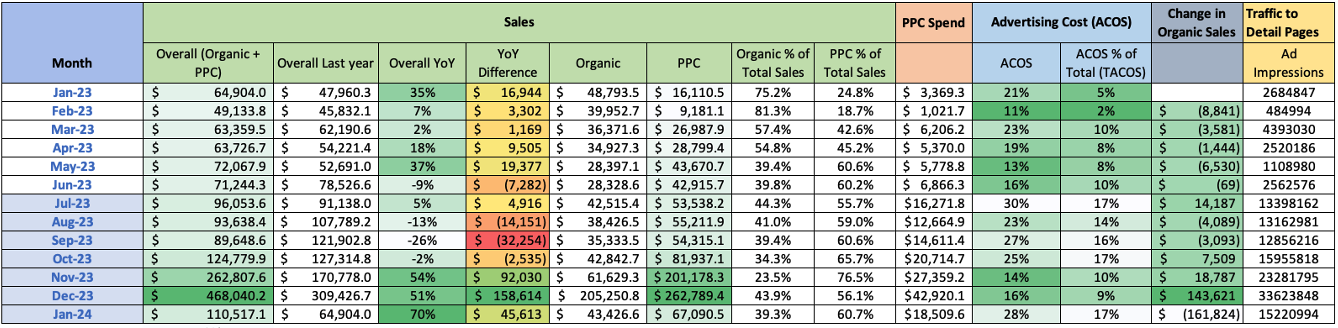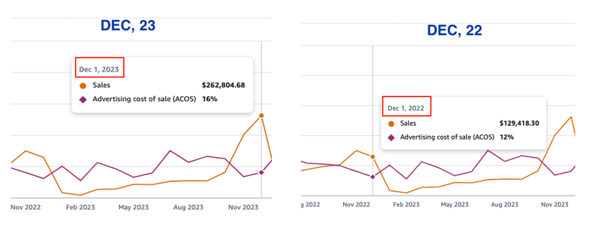 We scaled it up further to a 104% increase YoY in Dec, with sales going from $129k to $263k (+ $133k), with a 4% increase in ACOS.