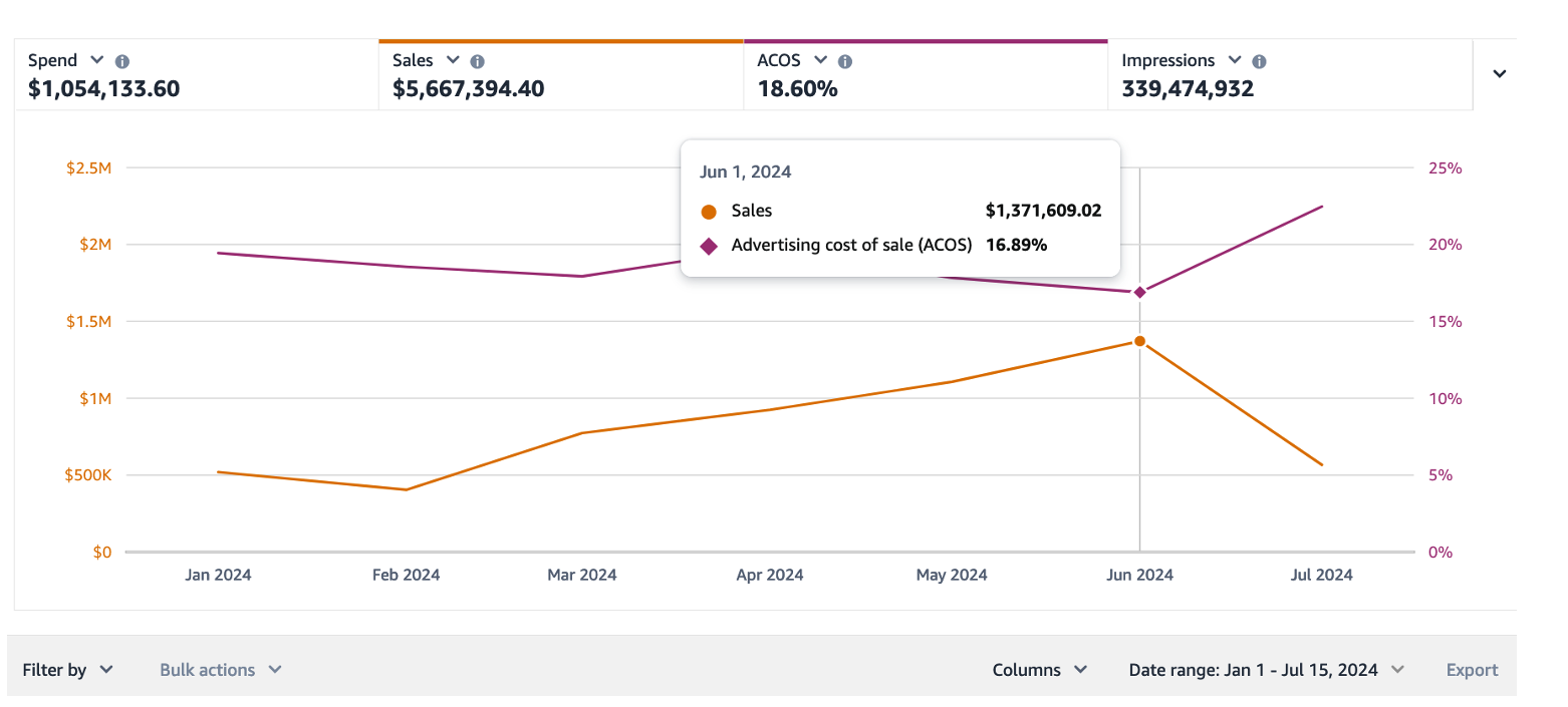 The results speak for themselves. In just four months, we took the account from $1.45M to over $2M in monthly sales—a 43% increase—while improving ACOS from 17.9% to 16.9%. June saw 88.6% YoY growth, and July metrics exceeded 500% YoY in key areas. The account wasn't just growing—it was scaling profitably with room to push even harder.